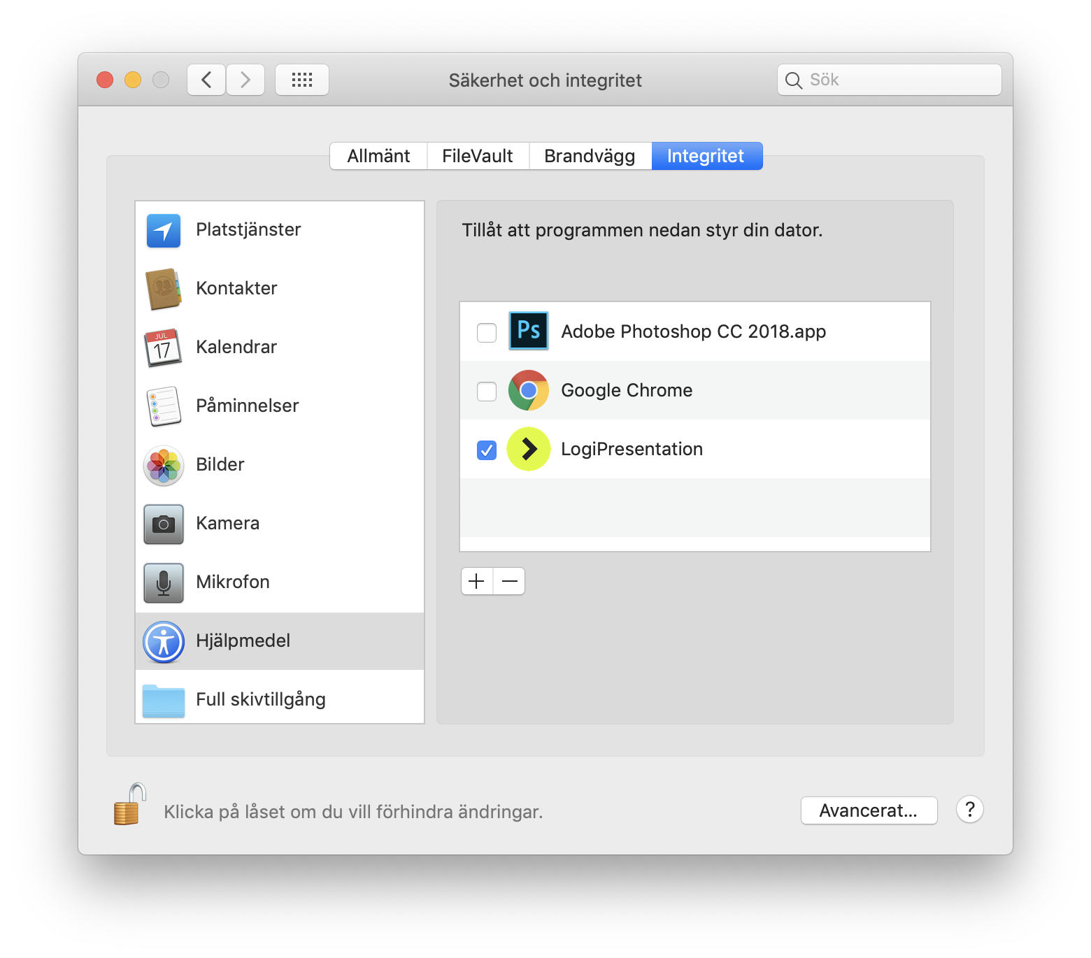 I den högra panelen markerar du rutan för LogiPresentation för att ge programmet tillgång till att styra datorn. Om du inte kan interagera med kryssrutorna klickar du på låsikonen längst ner till vänster och markerar sedan rutorna.