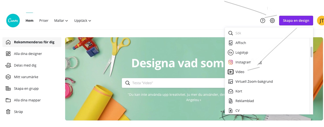 Börja med att skapa ytan du vill jobba med. Det finns färdiga mallar men det går att bra börja med en tom yta. Här kan man från början välja Video. Då skapas en 1920×1080 px yta att jobba med. Men det går precis lika bra att jobba med film i vilken mall eller yta som helst tex Instagram-mallarna.