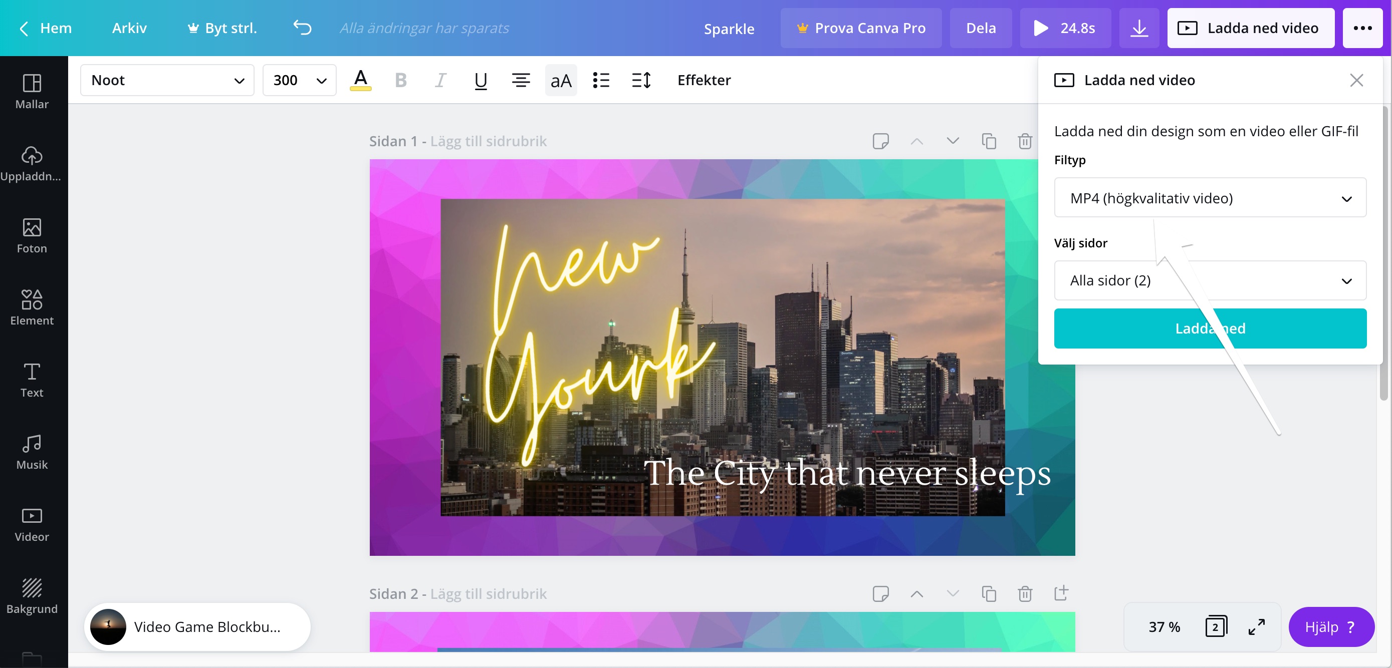 Lägg till eventuell musik, text och grafiska element. Notera att det inte går att ladda upp egen musik utan man nöja med det som finns på Canva.