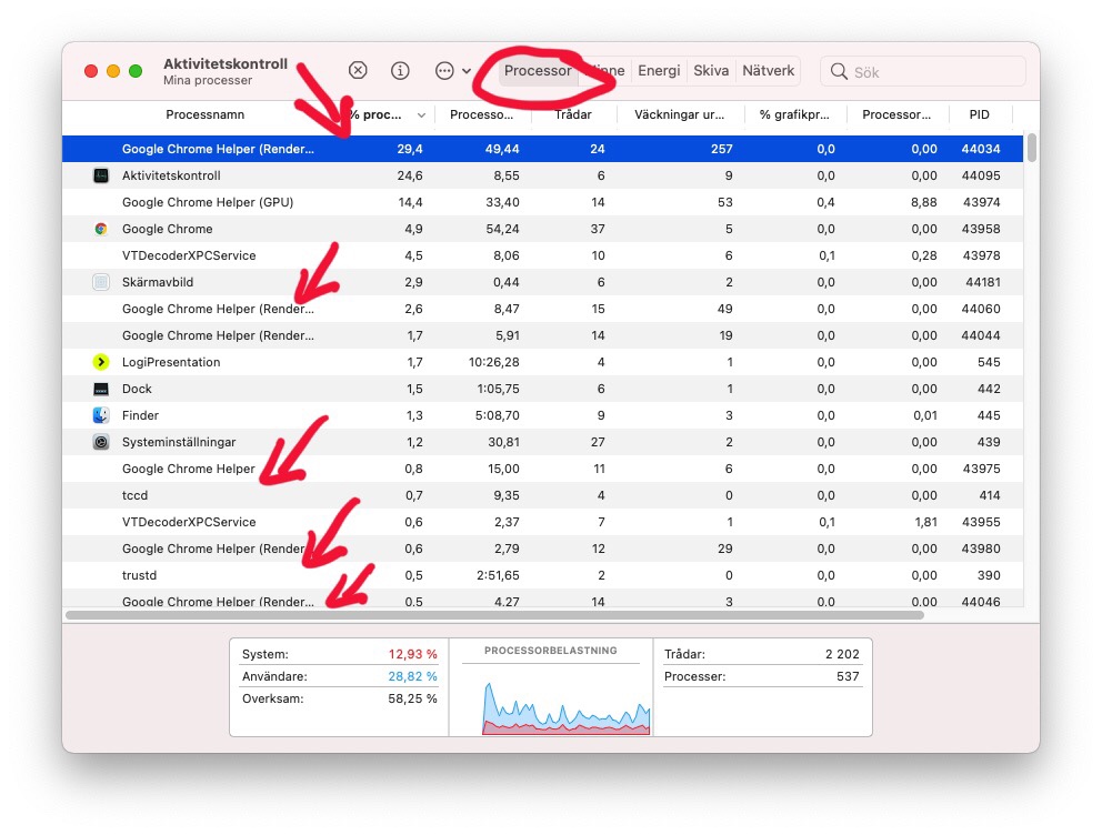 2. Se om Google Chrome Helper är aktiv och dra mycket kraft. Ser det ut som på bilden så är det absolut så.