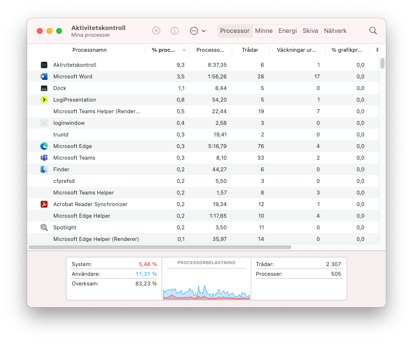 - Börja med att öppna Aktivitetskontroll. Kolla på Processor och se om det är så att att Microsoft Teams använder mycket kraft. Om det är så gå vidare till nästa punkt.