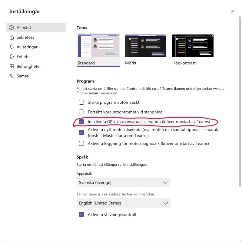 En annan (och förmodligen nödvändig) lösning är att inaktivera GPU (Graphics Processing Unit) maskinvaruacceleration i Microsoft Teams app. Relativt enkla applikationer som Microsoft Teams behöver egentligen inte rendering på GPU-nivå men Microsoft har satt det här som standard, gissningvis för att säkerställa att videomöten ska fungera stabilt på datorer oavsett ålder. Eftersom inställningen gör att det används mer av ditt grafikkort kommer din CPU- och batterianvändning att öka och därmed kommer fläktljud lika säkert som ett nyhetsbrev från Apotea. Så lösningen blir alltså att ändra inställningen i Microsoft Teams. Så här gör du: