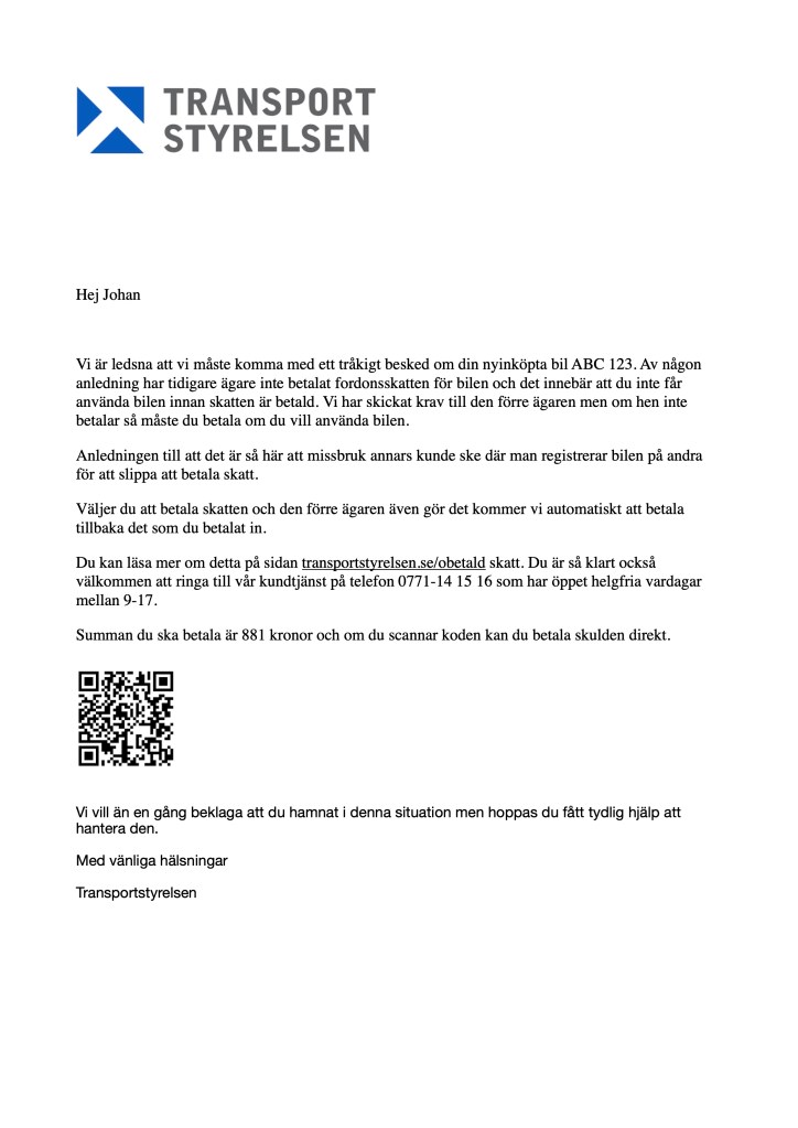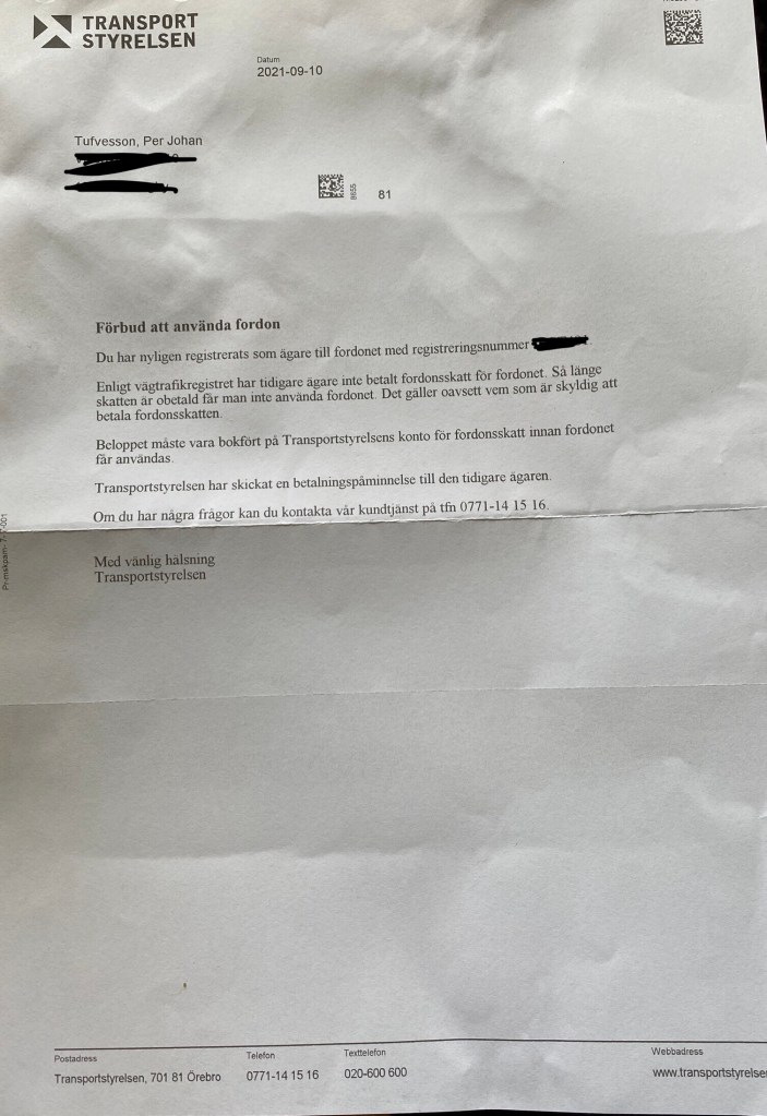Några månader senare landar ett brev från Transportstyrelsen i brevlådan. Förre ägaren har inte betalat fordonsskatten. Bilen får hädanefter inte användas. För att den ska få användas ska skatten betalas och Trafikverket har krävt förre ägaren på skatten. Och ungefär där slutar infon. Irriterande så klart men irritationen är faktiskt mest riktad mot Transportstyrelsen och inte mot ägaren som inte skött sina skyldigheter.