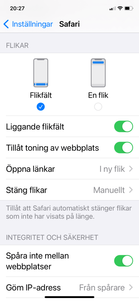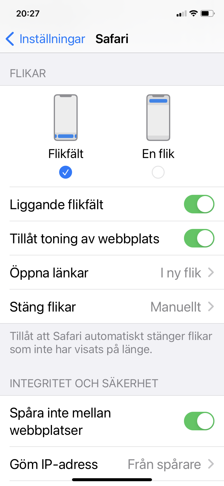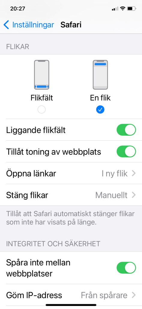 Har du uppdaterat din iphone till ios 15.1 och till din fasa upptäckt att adressfältet i Safari flyttat från toppen till botten? Vill du allt ska vara precis som vanligt? Lugn, bara lugn. Det är lätt fixat. Gå in på Inställningar och sedan Safari. Under Flikar väljer man sedan En flik istället för Flikfält. Nu ser Safari ut som förr.