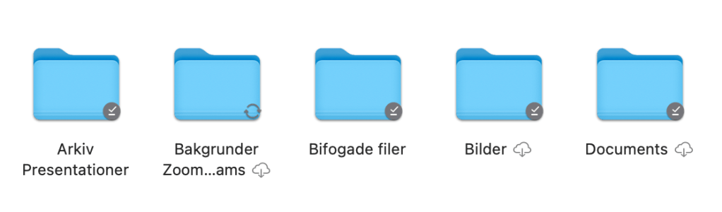En nerladdad mapp har en grå bock och indikerar att här har vi en lokalt tillgänglig fil eller mapp. En mapp vars filer enbart finns i molnet och är reda att laddas ner har istället en molnssymbol.